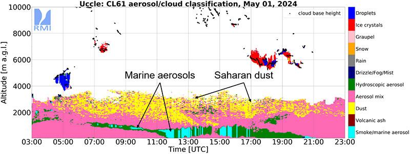 CL61 profile identifies marine aerosols shown in green and Saharan dust in yellow