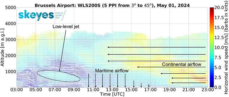 Wind lidar profile data to show low-level-jet from North Sea and Continental airflow.