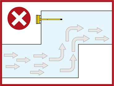Es ist durchaus üblich, Kanalsensoren in eine Totleitung einzubauen (Abbildung 1). In dieser Situation passiert der Hauptluftstrom den Kanalsensor überhaupt nicht, sodass die gemessene Luft für die Feuchte und Temperatur des Hauptluftstroms nicht repräsentativ ist. Um dieses Problem zu vermeiden, muss der Sensor direkt im Hauptluftstrom installiert werden. Dies ist besonders wichtig, wenn im Kanal hohe Feuchte und niedrige Strömungsgeschwindigkeiten bestehen.