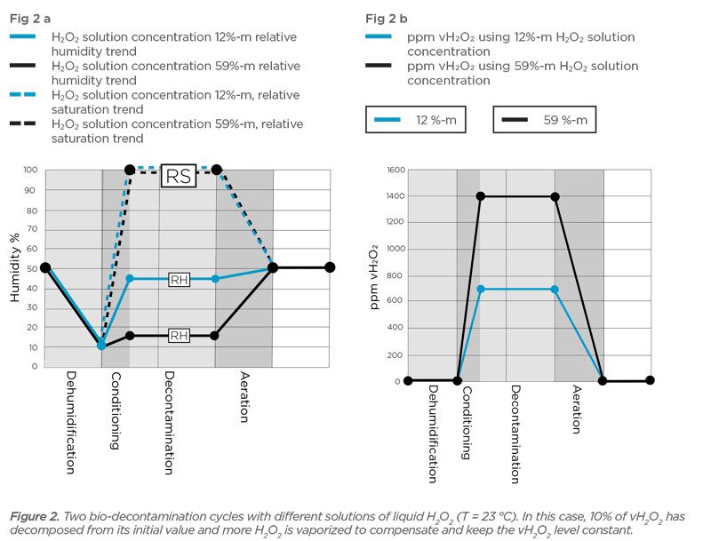 Der Unterschied zwischen den Prozessen liegt in der verwendeten H2O2-Lösung. In den Grafiken stellen die blauen Linien die Biodekontamination dar, die mit einem wässrigen Lösungsverhältnis von 12 % H2O2 zu 88 % H2O durchgeführt wurde. Die schwarzen Linien repräsentieren die Biodekontamination mit einem Lösungsverhältnis von 59 %-m H2O2 zu 41 % H2O.