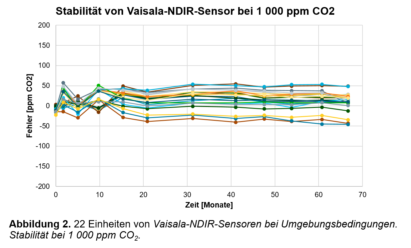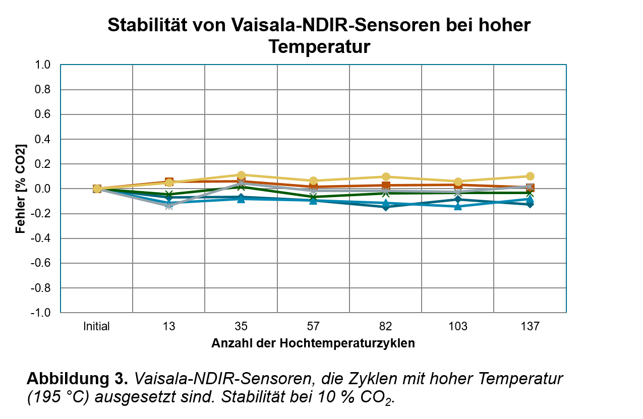 Diese Referenzmessungen bedeuten, dass die NDIR-Technologie von Vaisala langfristig stabil ist, selbst in anspruchsvollen Umgebungen. Das Testen von Vaisala Sensoren unter verschiedenen Bedingungen hat zu konsistenten Messwerten des CO2-Gehalts sowohl bei niedrigen als auch bei hohen Konzentrationen geführt. Beispielsweise zeigten über einen Zeitraum von fünf Jahren 22 Geräte, mit denen eine CO2-Konzentration von 1 000 ppm bei Raumtemperatur gemessen wurde, eine ausgezeichnete Stabilität (Abb. 2). Auch die Beständigkeit der Vaisala Sensoren gegenüber hohen Temperaturen hat sich als überlegen erwiesen (Abb. 3).
