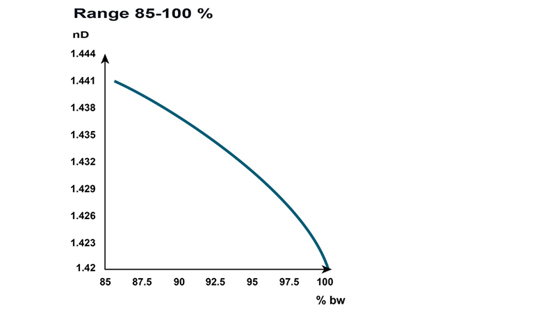 Das Vaisala Prozessrefraktometer ermöglicht im Vergleich zu einem Dichtemessgerät eine präzisere und zuverlässigere Messung der Schwefelsäurekonzentration im Bereich von 85 bis 100 %. Ab 94 % flacht die Dichtekurve ab, d. h. Messungen von Konzentrationen ab 95 % können mit einem Dichtemessgerät nicht durchgeführt werden.