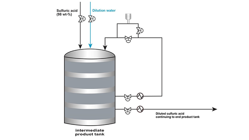 Abbildung: Verfahren zur Schwefelsäureverdünnung mit Vaisala Prozessrefraktometer, montiert in einer Zirkulationsschleife. Verdünnung ist ein Chargenprozess.