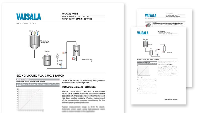 Das Vaisala K PATENTS® Prozessrefraktometer wird eingesetzt, um die Konzentration der gekochten Stärke zu steuern. Das Refraktometer überprüft, ob die Flüssigkeit richtig gekocht wurde, und zwar, ob die Stärkeviskosität konstant und der Gesamtfeststoffgehalt stabil bleiben, auch wenn in Chargen gekocht wird. Die genaue Konzentrationsmessung sorgt für eine gleichbleibende Qualität bei der Herstellung unterschiedlicher Papiersorten.