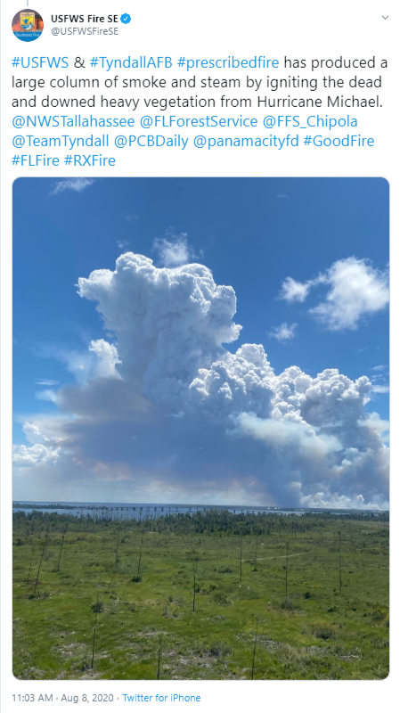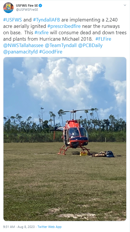 We fast-forward to August 8 at Tyndall. The United States Fish and Wildlife Services Fire Management Division and officials from Tyndall Air Force Base ignited a prescribed fire near the runways of the Air Force Base to consume the downed trees and other plants. Prescribed fires are human started fires that have several benefits to the environment, including removing dead vegetation that could burn in a wildfire, encouraging the growth of native vegetation, and help plant and animal species that rely on fire to improve their habitats.