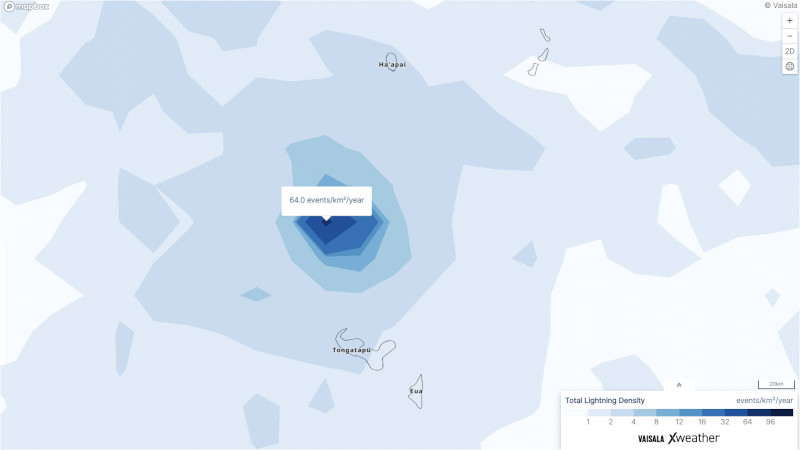 The cataclysmic eruption of the Hunga Volcano in the Kingdom of Tonga on January 15, 2022, produced the most extreme concentration of lightning ever detected. The GLD360 network recorded almost 400,000 lightning events near the Hunga Volcano that day. At one point, more than 25,500 lightning events were detected in just five minutes. More information about this incredible event can be found in the Vaisala Xweather 2022 Annual Lightning Report.
