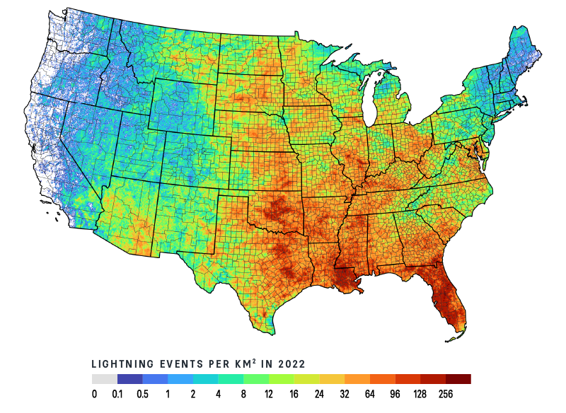 Lightning density tells us how many lightning events occurred per square kilometer of an area over a given period. This map shows lightning density across the continental United States in 2022. Calculating lightning density helps us compare lightning activity across regions with different sizes such as counties, states, or countries.