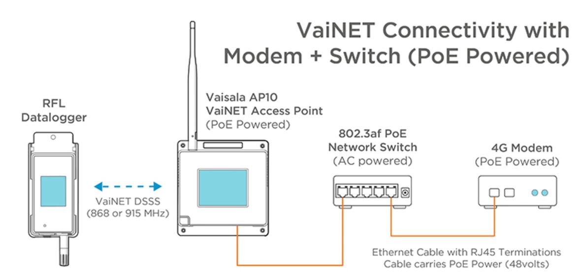 In the application, the RFL100 temperature probes were placed inside fridges and freezers. The AP10 was connected by Ethernet cable that included Power over Ethernet (PoE) to a network switch inside the RV. A typical PoE network switch provides roughly 48 to 50 volts along with network connectivity. This eliminated the need for DC power adapters for the AP10 network access devices. A 4G modem, which was also PoE-capable, was used. This allowed only one outlet to power the monitoring system; the network switch uses a power outlet and provides power to both the AP10 and the modem via PoE. However, all devices are equipped with power adapters, and if needed, the AP10 could connect directly to the modem.