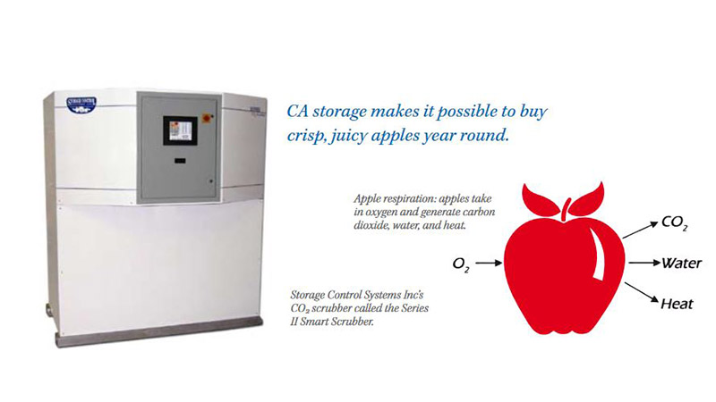 Controlled atmosphere (CA) storage is a widely used technique for long-term storage of freshly picked fruits and vegetables. Historically, CA storage has been the primary method for the long-term storage of apples. Through a biological process called respiration, apples take in oxygen and generate carbon dioxide, water, and heat. Controlled Atmosphere storage is an entirely natural process that reduces the effects of respiration to a minimum by controlling the environmental conditions surrounding the stored fruit. CA storage makes it possible to buy crisp, juicy apples year round. Many cultivars of apples can be preserved for a remarkable 9 – 12 months in CA storage, as opposed to only 2 – 3 months if using refrigerated storage.