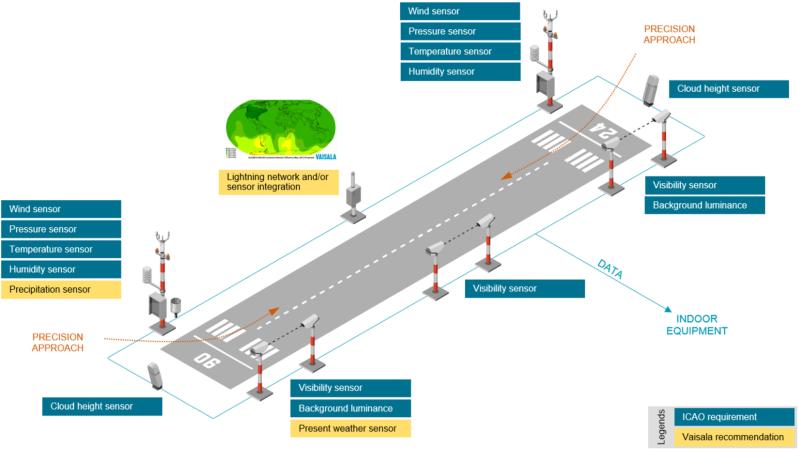 - Runway sensors measure variables such as wind speed and direction, precipitation, visibility, present weather, cloud layer/ceiling, and runway visual range (RVR)