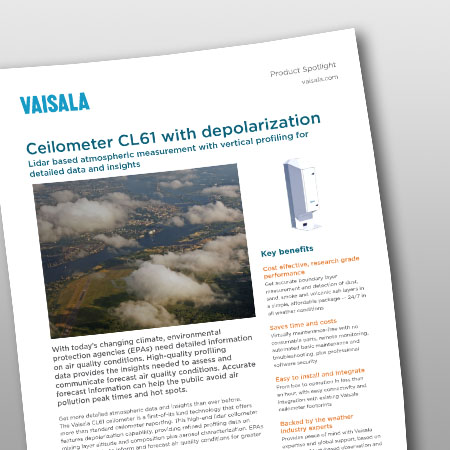 Vaisala’s CL61 is a first-of-its-kind ceilometer, combining crucial cloud height and profile data with advanced depolarization for precipitation and particulate differentiation. This puts CL61 in a class of its own and enables agencies, governments, and companies to operate more intelligently and efficiently than ever before.