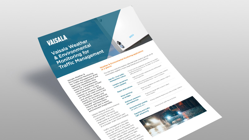 Vaisala Weather & Environmental Monitoring for Traffic Management gives road authorities, cities and traffic management system integrators the tools they need for comprehensive, real-time awareness of their road networks — in any season or situation. The world’s best sensors for weather and roads condition ensure unmatched accuracy and reliability.