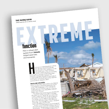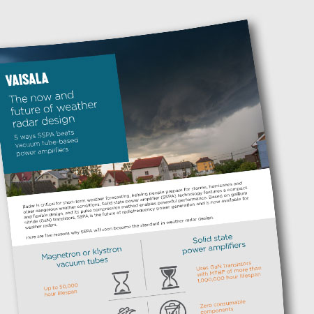 Learn more about the cutting-edge C-band weather radar technology for high-performance weather surveillance and smart early-warning decisions. The newest addition to our solid state weather radar family, Vaisala Weather Radar WRS300 provides high performance and exceptional accuracy in an integrated, low-maintenance package for improved prediction of and preparation for adverse weather.