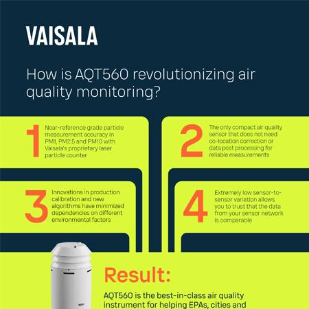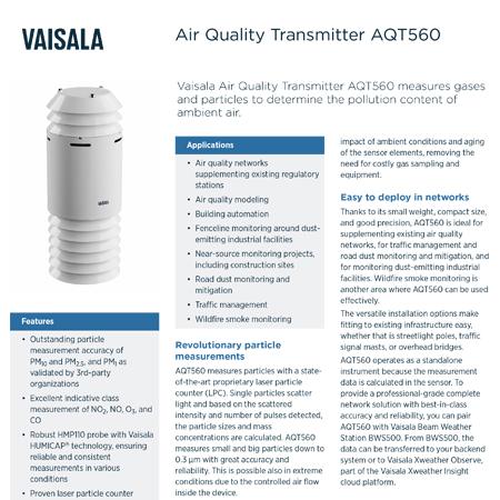 Vaisala Air Quality Transmitter AQT560 is the ideal monitoring and measurement sensor for these and other purposes — providing the accuracy and reliability you need with easy deployment and integration, all in a compact package. AQT560 has been extensively tested to perform in a wide range of environmental conditions, even in sand storms.