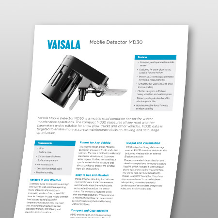 The Mobile Detector MD30 from Vaisala monitors road conditions, and transmits weather data from snow plows or any vehicle type without disruption — keeping your ground transportation or airport operations running smoothly and safely.