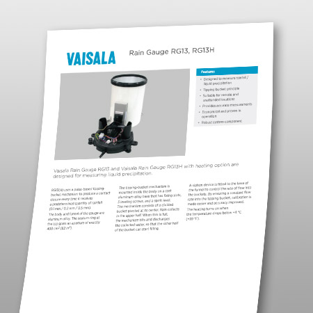 The Vaisala Rain Gauge RG13 (and the RG13H heated option) are built to measure liquid precipitation in remote and unattended applications, and designed to operate in even the harshest environments.