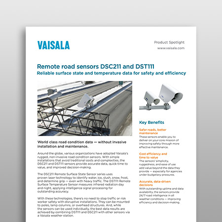 The DST111 Remote Road Surface Temperature Sensor is easy to install and lets you avoid cost and complexity. It keeps operations running safely and smoothly, with 24/7 road intelligence in all weather conditions, and empowers your decision making with accurate, reliable data. In tandem, the DSC211 Remote Road Surface State Sensor and DST111 provide a complete assessment of weather conditions, and these sensors can be easily integrated with existing weather systems, such as the Vaisala Road Weather Station.
