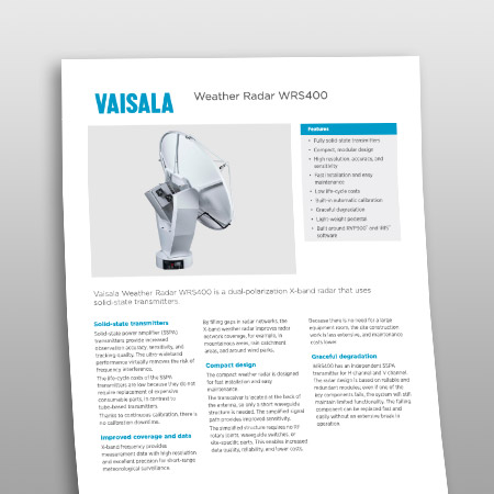 X-band Weather Radar WRS400 is short-range radar that is perfect for detailed localized weather detection. It can also be used to fill in the common detection gaps in traditional long-range networks to form a complete weather radar system that is unparalleled in quality and consistency.