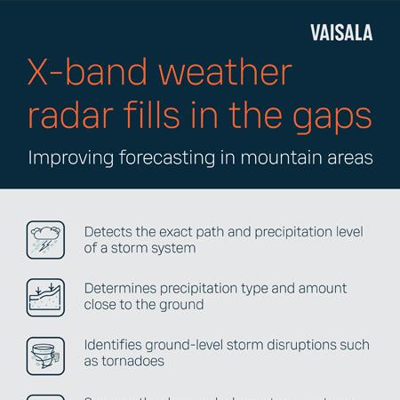 X-band weather radar is raising the bar in precision and reliability for modern weather radar systems. The technology outperforms conventional rain gauge networks, fills gaps left by C and S-band radar, and provides exceptional measurements for meteorological and hydrological applications. Vaisala's X-band Weather Radar WRS400 detects: