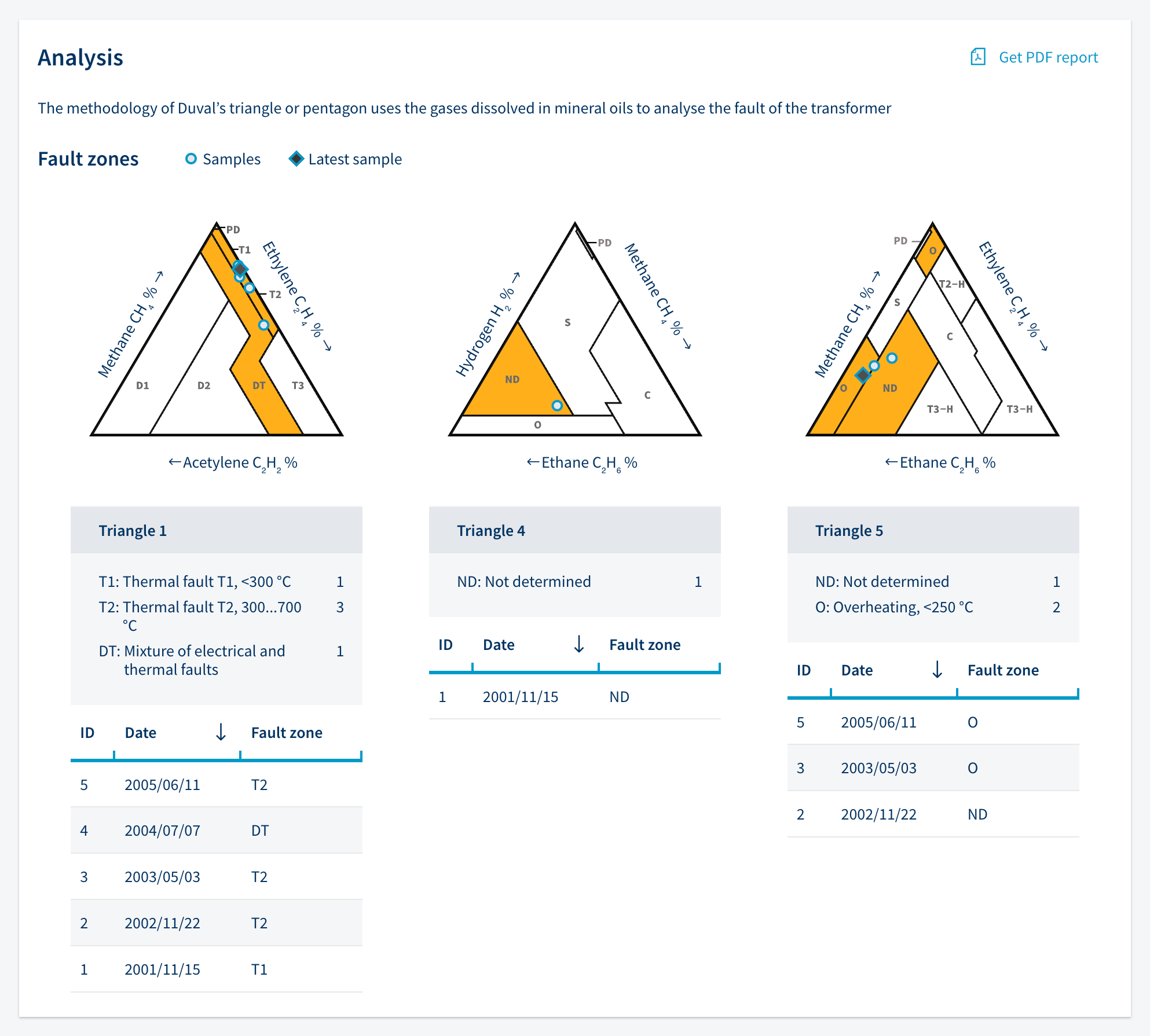 Si los gases exceden sus valores típicos, la calculadora visualizará los resultados en triángulos o pentágono 2 de Duval, lo que es prácticamente el método estándar para el análisis de tipo de falla DGA. También le brinda acceso rápido a las descripciones de los tipos de fallas reales y resalta sus puntos de datos de manera visual.