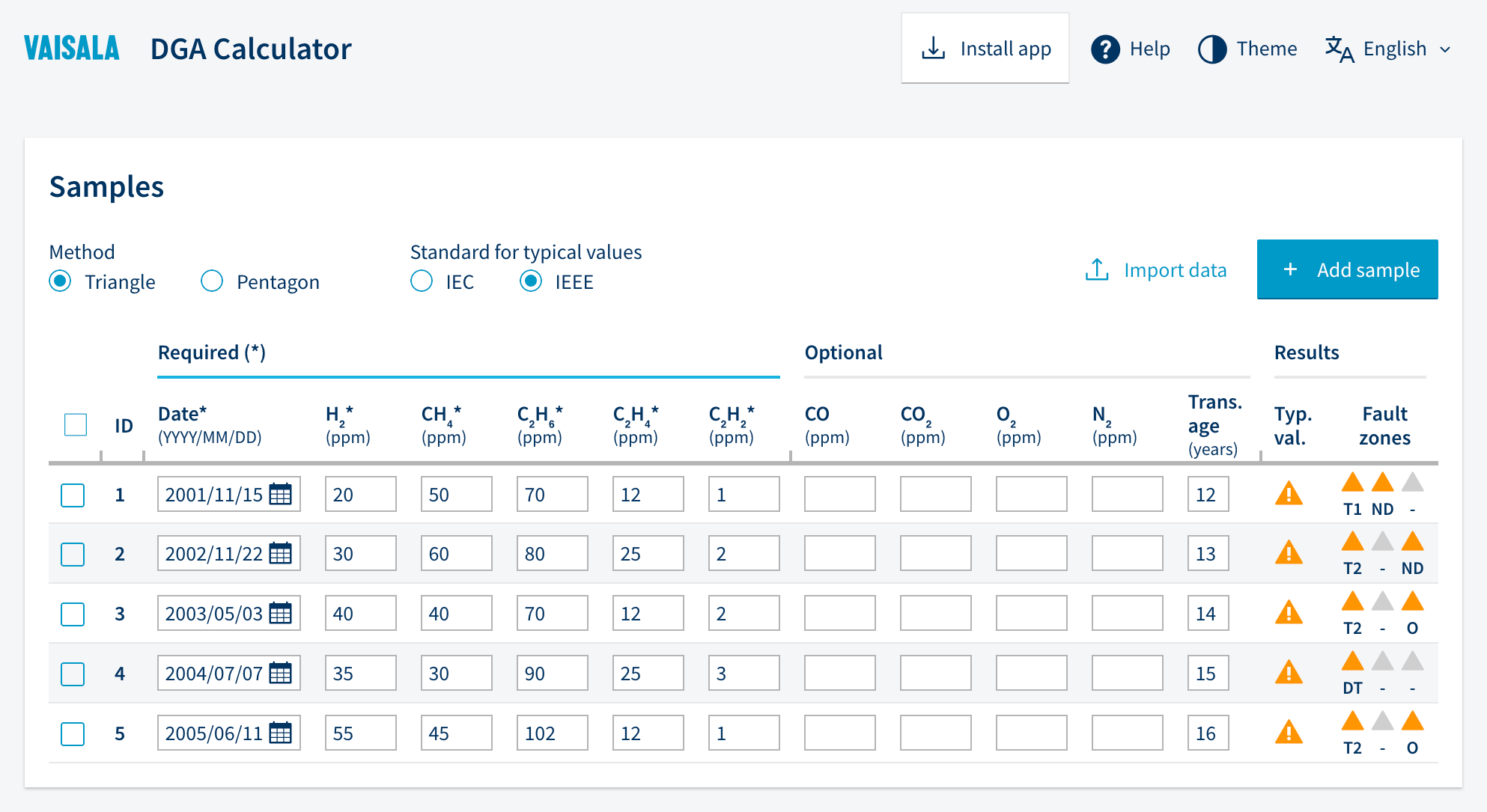 "Debido a la capacidad de ingresar puntos de datos actuales e históricos, la calculadora también le mostrará el cambio desde su primer resultado de DGA hasta el último, lo que le permitirá identificar de inmediato las tendencias de gasificación a lo largo del tiempo: lo más importante en DGA en línea ," explica la experta sénior de la industria de Vaisala, Senja Leivo.