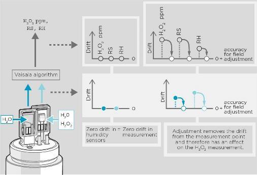Cuando se añade el vapor de peróxido de hidrógeno a un ambiente, se suma al vapor de agua existente, permitiendo que el instrumento de medición de humedad mida el agua pero no el vapor de peróxido.