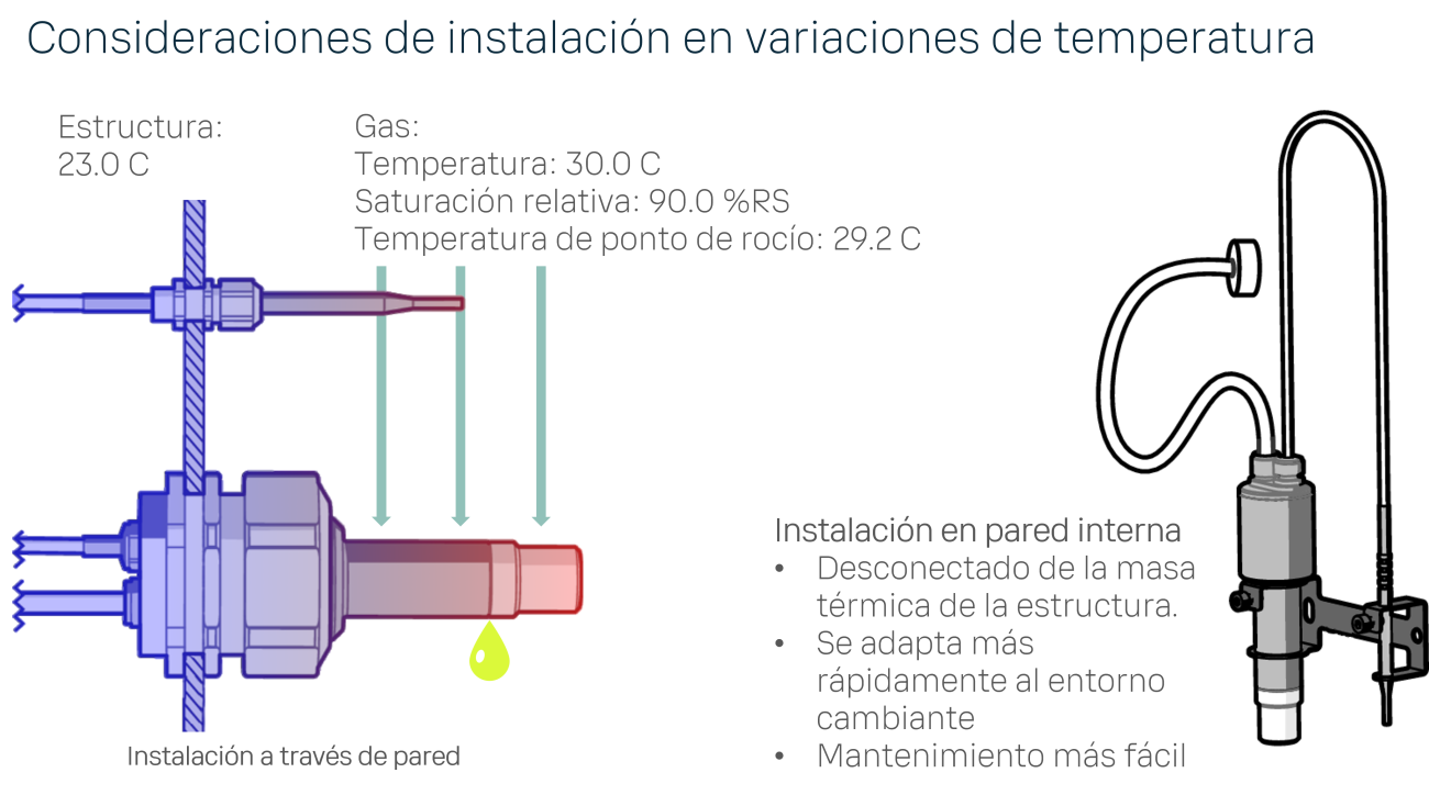 Si hay variaciones de temperatura relevantes entre el ambiente interno y externo de la cámara, puede producirse condensación. Para evitar esto, lo ideal es instalar la sonda completa dentro de la cámara con una prensa de cable vendida por Vaisala. Esta instalación es más fácil para hacer el mantenimiento y ajustes necesarios.