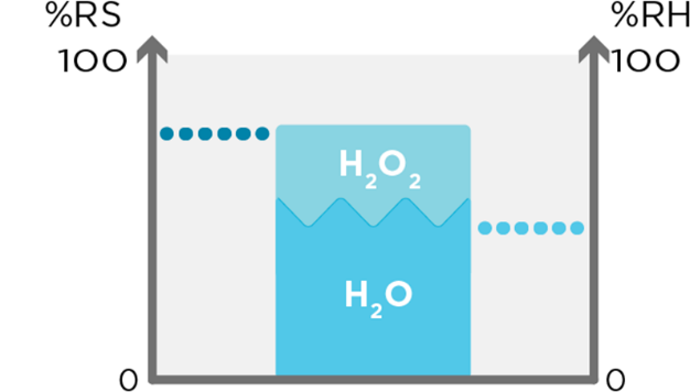 Tanto el nivel de vapor de agua como el de peróxido de hidrógeno vaporizado contribuyen al nivel de saturación. La concentración máxima de la solución depende de: