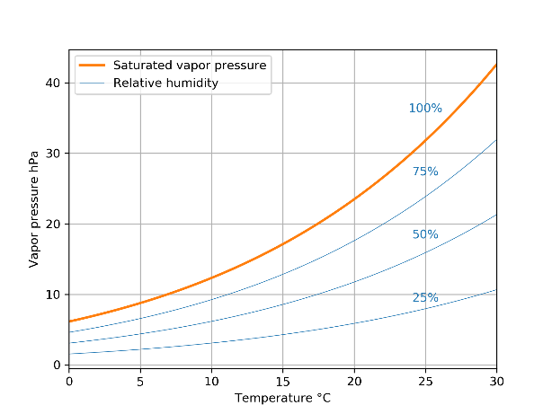 Curva de saturação de vapor: conforme a temperatura aumenta, pode-se colocar mais vapor de peróxido nesse ambiente aquecido. Quando o vapor chega a 100% ele entra no processo de condensação e vira líquido. Em temperaturas mais baixas há menos vapor e por isso chama-se umidade relativa, pois está diretamente relacionado à temperatura do ambiente.