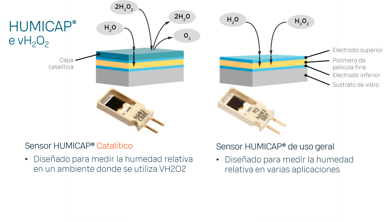 Diseñado para medir la humedad relativa en abiente donde se utiliza vapor de H0. En la cama superior donde hay contacto con el aire se encuentra la capa catalítica, no catalizando el vapor de agua. Diferente como el vapor de peróxido que el sensor romperá la molécula de agua y peróxido midiendo la humedad y la saturación relativa. Mediante la unión de los 2 sensores se obtiene el cálculo. iva, además de poder ser usado para realizar contrapruebas de sistemas de control en procesos de descontaminación.