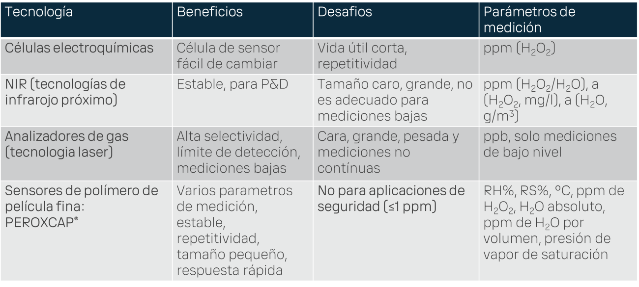 PEROXCAP® - Sensores capacitivos de polímero de película fina: tienen varios parámetros de medición (concentración en PPM, saturación y humedad relativa, temperatura) garantizando el control de las 3 leyes de la naturaleza durante el proceso. Es pequeña y compacta. fácil de calibrar, cambiar y mantener. tiene una respuesta rápida, pero su resolución mínima es de 10 ppm de vapor de peróxido. No lee el rango de 10 a 1 (aireación) que es recomendado para la apertura de la cámara y la seguridad de los operadores. Hoy en día hay cámaras que usan otro sensor junto para hacer la medición completa, chaveando las válvulas del sistema para lanzar el aire de la cámara a un sensor de baja (ej.: electroquímico). Con esto se obtiene un ahorro en el tiempo de aireación, incluso con dos sensores, poniendo la cámara a disposición más rápidamente para otros procesos de descontaminación. El Peroxcap también puede ser usado de forma portátil y paralela, haciendo mediciones y seguimiento a través del control de las variables y la saturación relativa, además de poder ser utilizado para realizar contrapruebas de sistemas de control en procesos de descontaminación.