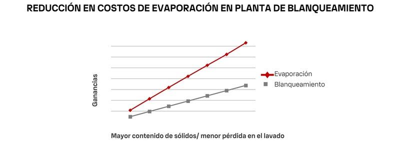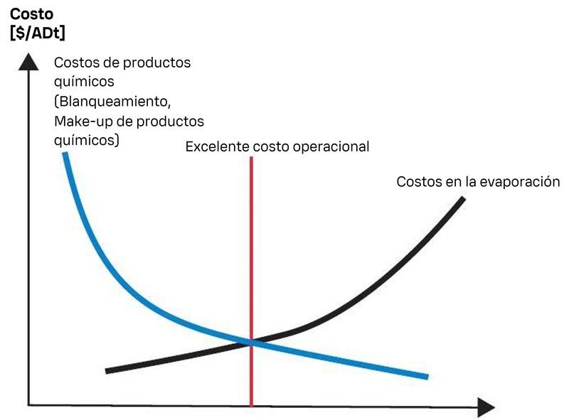 El gráfico muestra claramente, en términos de costo, la evaporación versus planta de blanqueado. Si hay un buen lavado con el menor consumo posible de agua, se tiene menos evaporación y, por consiguiente, menor necesidad del uso de productos químicos en el aclarado. Por eso es tan importante la optimización durante el proceso de lavado de la pasta marrón.
