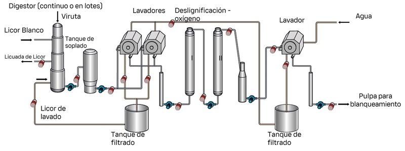 El siguiente es un ejemplo de proceso que muestra desde la parte del digestor, hasta la salida de la pulpa para el blanqueado. En él se puede visualizar las diversas posibilidades de instalación de refractómetros (en rojo) y donde pueden ser utilizados promoviendo: