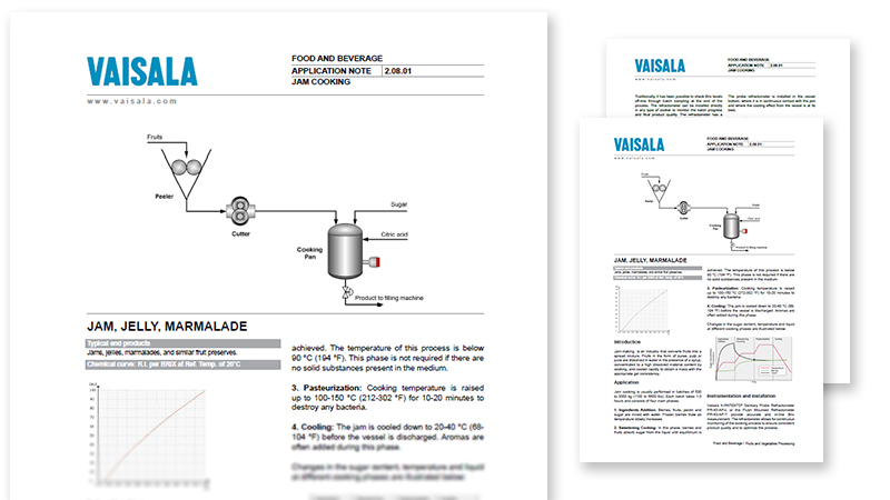 Descargue la nota de la aplicación para conocer detalles sobre cómo se utiliza el refractómetro sanitario Vaisala K-PATENTS® para medir la concentración de Brix en línea en la preparación de mermeladas. Esta medición le proporciona al proceso los siguientes beneficios: