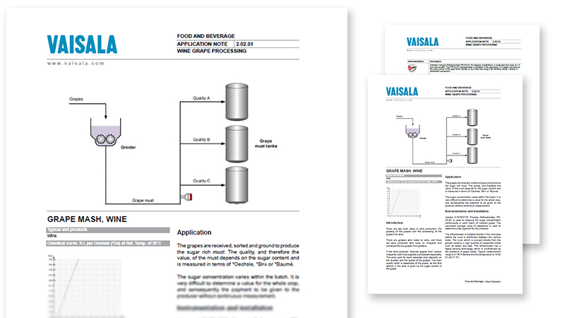 Descargue la nota de la aplicación para saber cómo se utiliza el refractómetro sanitario K-PATENTS® de Vaisala para medir continuamente la concentración de azúcar en cada lote de puré de uva. El dulzor o contenido de azúcar de las uvas se mide en términos de ° Oechsle, ° Brix, ° Baumé, gravedad específica o cualquier otra unidad de concentración y densidad utilizada por un cliente. El mosto obtenido de la uva contiene semillas y piel que, sin embargo, no tienen ningún impacto en la medición en tiempo real de nuestro refractómetro en línea debido a la tecnología de detección digital.