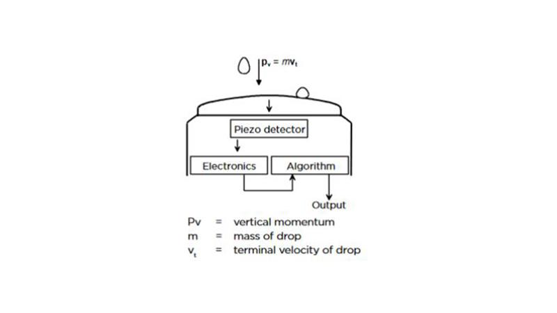 La medición de la lluvia se basa en la detección acústica de cada gota de lluvia individual a medida que impacta en la tapa del sensor. Las gotas más grandes crean una señal acústica más grande que la de las gotas más pequeñas. El detector piezoeléctrico convierte las señales acústicas en voltajes. La lluvia total se calcula a partir de la suma de las señales de voltaje individuales por unidad de tiempo y la superficie conocida del sensor RAINCAP®. Además, se puede calcular la intensidad y la duración de la lluvia.