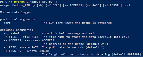 Python .\Modbus_RTU --file datalog.csv --address 240 --rate 10 --length 48 COM6