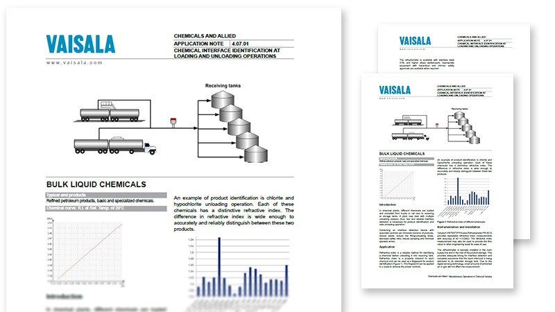 Taitekerroin on erittäin luotettava ja tarkka (tarkkuus jopa nD +/-0,0002) tapa eri kemikaalien tunnistamiseen ennen niiden purkamista vastaanottosäiliöön. Vaisala K-PATENTS® -prosessirefraktometri mahdollistaa rajapinnan nopean, reaaliaikaisen tunnistuksen suoraan pääsyöttölinjasta. Yhdistämällä refraktometri automaattiseen ohjaukseen saadaan riittävästi aikaa rajapinnan tunnistamiseen ja täyden varmuuden saantiin siitä, että nestemäinen kemikaali toimitetaan oikeaan säiliöön.