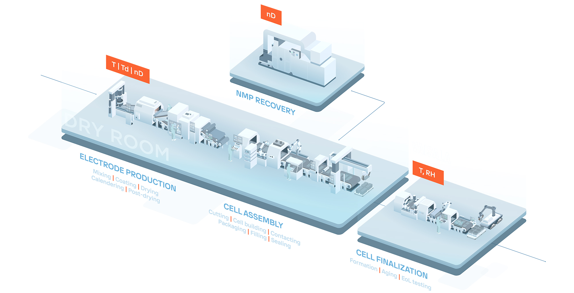 Tuotantolaitokset – erityisesti gigatehtaat – ovat valtavia, ja näiden valvottujen ympäristöjen kuivaaminen tiettyyn kastepisteeseen vaatii paljon energiaa, samoin kuin jotkin käsittelyvaiheet, kuten katodien kuivaus.