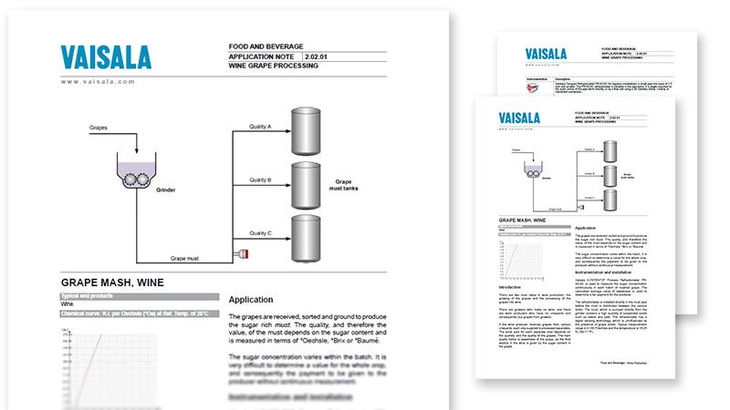 Lataa sovelluskuvaus ja lue, miten hygieenistä Vaisala Polaris ‑refraktometriä voidaan käyttää kunkin rypälemehuerän sokeripitoisuuden jatkuvaan mittaamiseen. Rypäleiden makeus eli sokeripitoisuus mitataan Oechsle-, Brix- tai Baumé-asteina, ominaispainona tai käyttämällä jotakin muuta asiakkaan määrittämää pitoisuuden yksikköä. Rypäleen puristemehu sisältää siemeniä ja rypäleiden kuoria. Refraktometrin digitaalisen havaitsemisteknologian ansiosta niillä ei kuitenkaan ole vaikutusta reaaliaikaiseen mittaukseen.