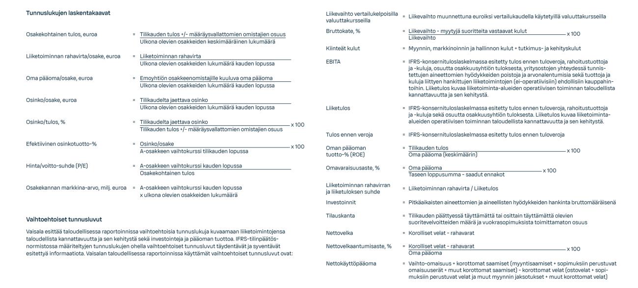 Vaisala esittää konsernin tilinpäätöstiedot miljoonina euroina, ellei muuta ole ilmoitettu. Kaikki esitetyt luvut on pyöristetty, minkä vuoksi yksittäisten lukujen summa voi poiketa esitetystä summaluvusta. Konsernitilinpäätös on laadittu alkuperäisiin hankintamenoihin perustuen, ellei laatimisperiaatteissa ole toisin kerrottu. Tekstiosioissa edellisen tilikauden vertailutiedot esitetään suluissa.