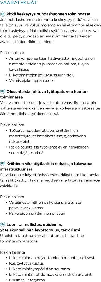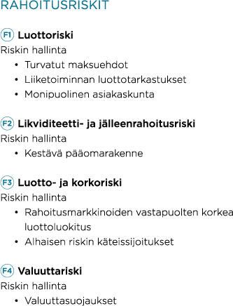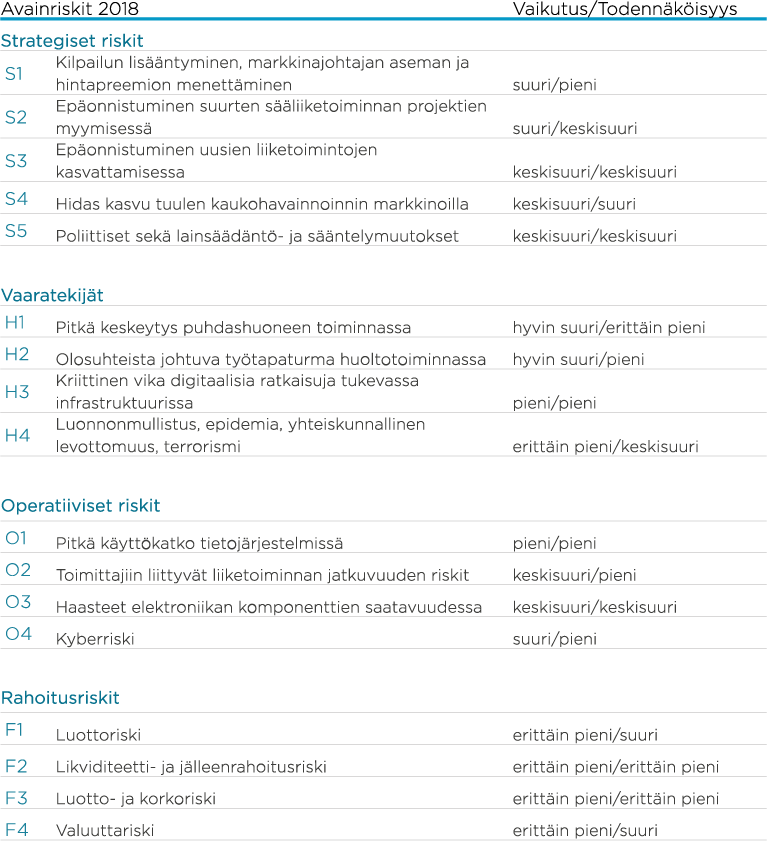 Riskienhallinta on integroitu tärkeimpiin liiketoimintaprosesseihin ja toimintoihin sisällyttämällä riskien tunnistus-, arviointi-, hallinta- ja raportointitoimenpiteet ydinprosesseihin. Olennaisimmat riskit tarkastellaan johtoryhmän toimesta kahdesti vuodessa.
