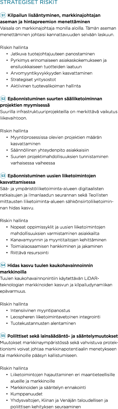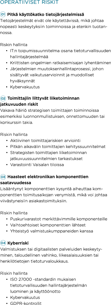 Erilaiset riskit voivat vaikuttaa epäsuotuisasti Vaisalan liiketoimintaan. Lisää tietoa Vaisalan merkittävistä lyhyen ja pitkän aikavälin riskeistä löytyy Vaisalan vuosikertomuksista ja osavuosikatsauksista.