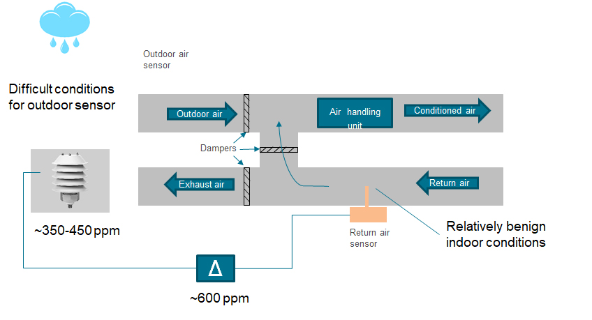 Le CO2 est mesuré pour obtenir de bons débits d'air dans les locaux fermés. La différence entre les concentrations de CO2 à l'intérieur et à l'extérieur est un indicateur de l'occupation – le nombre de personnes qui se trouvent dans l'espace que vous essayez de contrôler. Par exemple, si vous avez un capteur de CO2 extérieur, le trafic routier augmentera le niveau de CO2 . Ce niveau est comparé au résultat indiqué par un capteur de CO2 intérieur, qui pourrait être installé par exemple dans un conduit d'air de retour (figure 2).