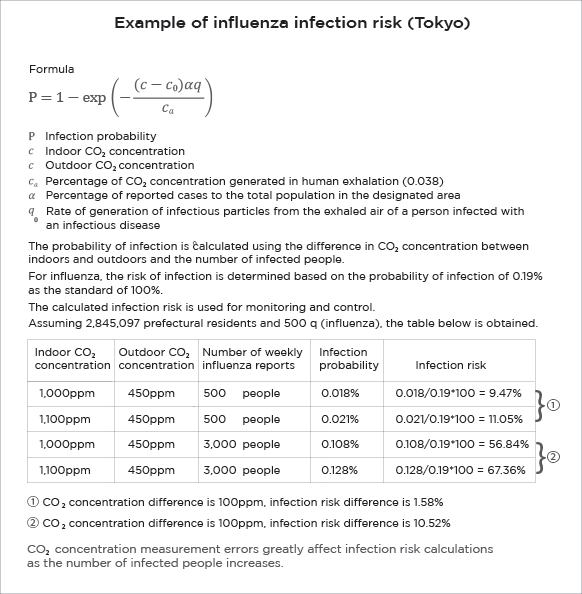 La probabilité d'infection lorsque la concentration intérieure de CO₂ passe de 1 190 ppm à 1 290 ppm augmente de 2 % en présence de 500 personnes infectées. La probabilité d'infection augmente de 10 % en présence de 3 000 personnes infectées. Dans le cas de la grippe, le risque d'infection de 0,19 % sera converti au niveau d'alerte de 100 % par défaut lorsque des alertes et des contrôles ont lieu.