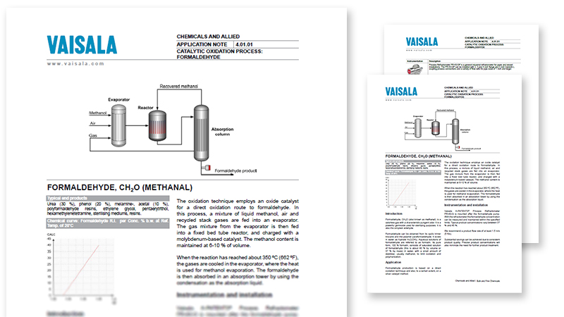 Le réfractomètre de procédé Vaisala K-PATENTS® est utilisé pour mesurer la concentration de formaldéhyde et la maintenir aux niveaux requis, généralement entre 37 % et 45 %. Cela garantit une qualité de produit constante et élimine le besoin de traitement supplémentaire du produit.