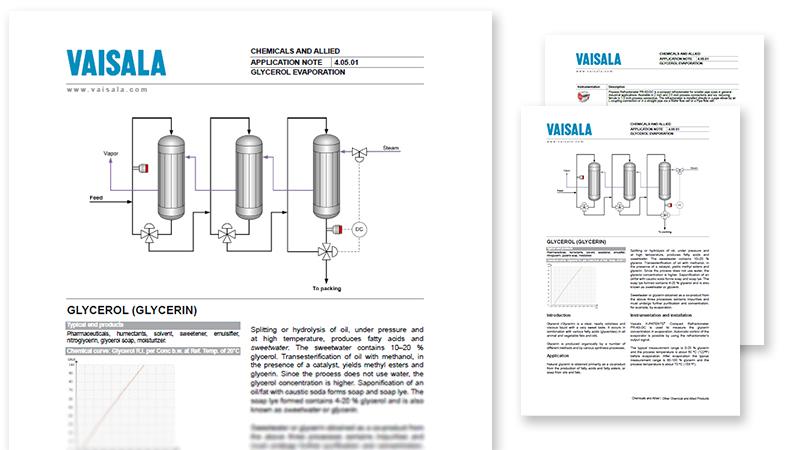 Le réfractomètre compact Vaisala K-PATENTS® en ligne est utilisé pour mesurer la concentration de glycérine lors de l'évaporation. Le contrôle automatique de l'évaporateur est possible en utilisant le signal de sortie du réfractomètre.