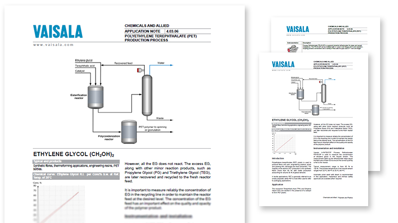 Le réfractomètre de procédé Vaisala K-Patents® est utilisé pour mesurer la concentration d'éthylène glycol dans le flux de recyclage. La mesure prise par le réfractomètre permet d'ajuster le taux d'alimentation en éthylène glycol (EG) pur pour garantir que la quantité correcte est introduite dans le réacteur.
