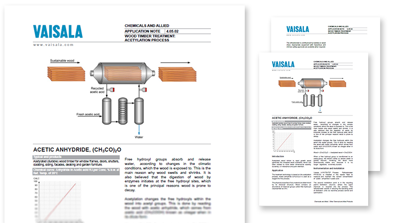Le réfractomètre de procédé Vaisala K-PATENTS® en ligne est utilisé pour mesurer et maintenir la concentration correcte d'anhydride acétique dans l'acide acétique. Le réfractomètre est également utilisé dans les colonnes de distillation de l'usine de recyclage, où le produit chimique usagé est recyclé dans le processus. Le réfractomètre aide à réduire les coûts d'exploitation des unités de distillation via le contrôle et l'optimisation des processus en temps réel.