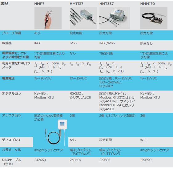 いくつかのヴァイサラのソリューションには、加温プローブ技術が含まれています。HMM170、HMT317、HMT337、および HMP7 においては、注文時、すべての製品が設定可能です。次の表では、高湿度の産業用途に適したソリューションを一覧にしました。